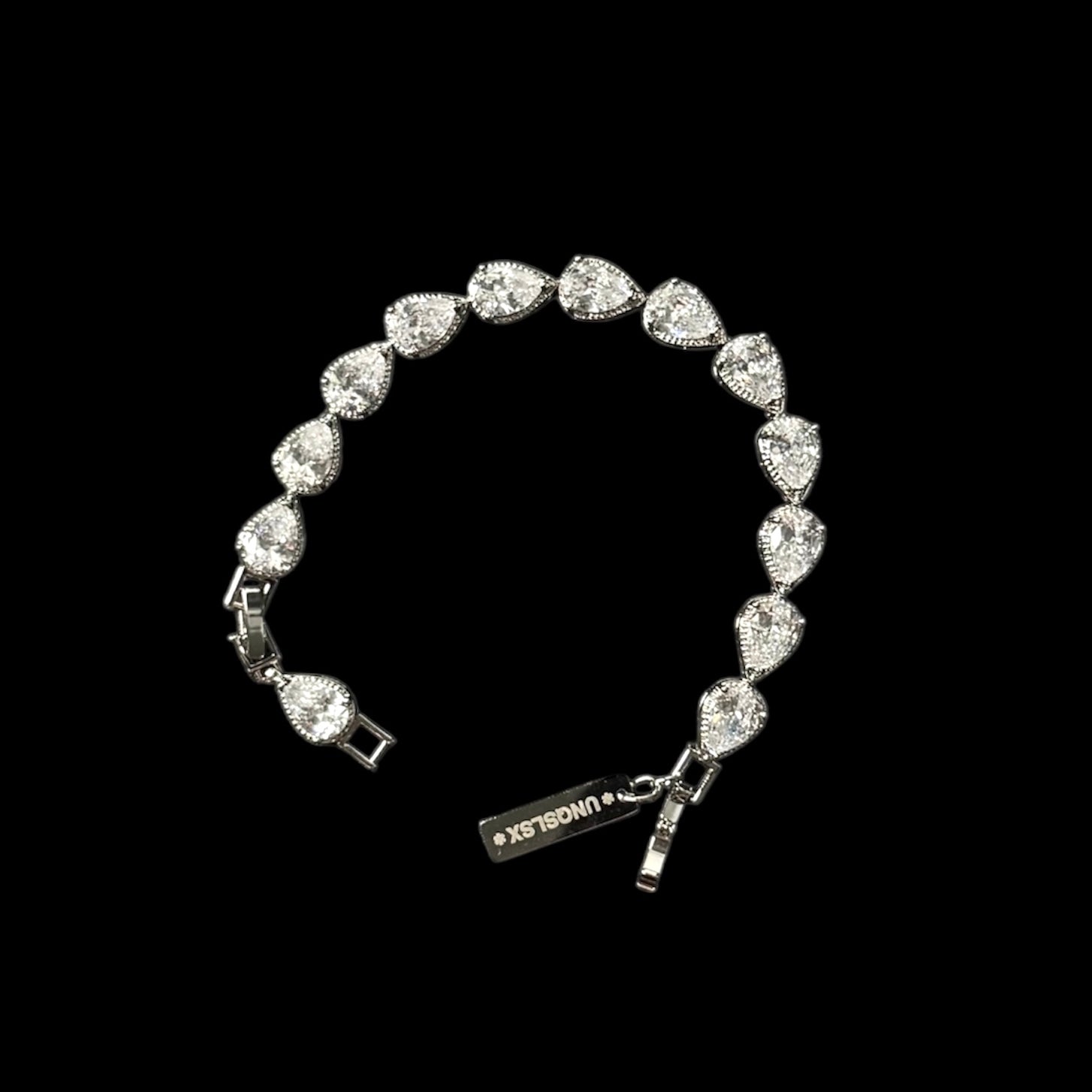 FEATURES A UNIQUE WATER-DROP-INSPIRED LINK DESIGN, SET WITH AAA-GRADE CZ STONES FOR A BRILLIANT, DIAMOND-LIKE SPARKLE THAT CATCHES LIGHT FROM EVERY ANGLE.